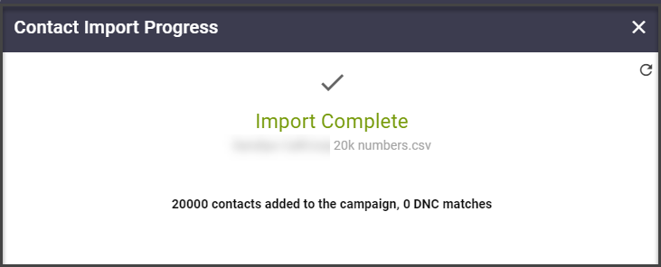 The magnify glass icon next to a campaign in the Preview Campaigns grid now directs you to a “Contact Import Progress” modal that identifies current status when loading numbers to a campaign. For larger lists, an import in progress notification shows the name of the list being loaded along with the number of contacts added, how many were removed for Do Not Contact and how many remain to be added. If the list has been fully loaded, an import complete notification shows the number added and the number of Do Not Contact matches. (10404)