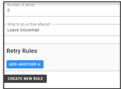 In order to apply retry logic, the rules you have created must be assigned to a campaign. The new “Retry Rules” tab under campaign settings allows you to indicate how many times you would like to retry a number as well as whether to hang up or leave voicemail after the final retry attempt. This tab allows you to add rules as well as drag and drop to set rule order. You also have the option to create a new rule by clicking the “Create New Rule” button. (10234)