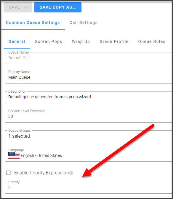 General: This tab now allows you to use the “Create a New Queue” button to navigate directly to new Preview Dialer queue creation. Having created and saved a queue, the Queue dropdown in campaign configuration automatically refreshes to include it. (10141, 10142) Additionally, queue configuration now includes options to specify competency, language, priority and priority expression requirements. (10386)