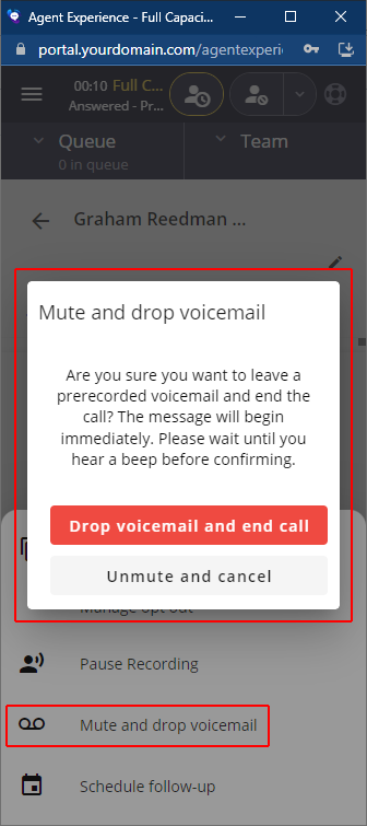 - On selection the agent is muted immediately (to prevent agent side background noise from interfering with the voicemail drop) and a Mute and drop voicemail modal is displayed containing the following clarification: