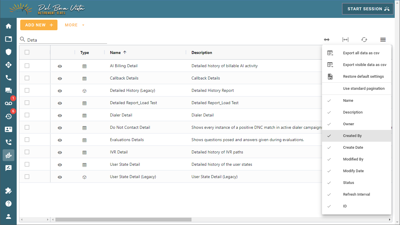 - The first is to define the report name, description, and data source. The data source determines which columns can be included in the report. For example, the Contacts (Interactions) data source offers columns related to contacts and interactions, while an Evaluations data source provides columns related to quality management evaluations. Data sources exist for all areas of the platform: billing, contacts and interactions, dialer, evaluations, IVR, recents, surveys and user states.